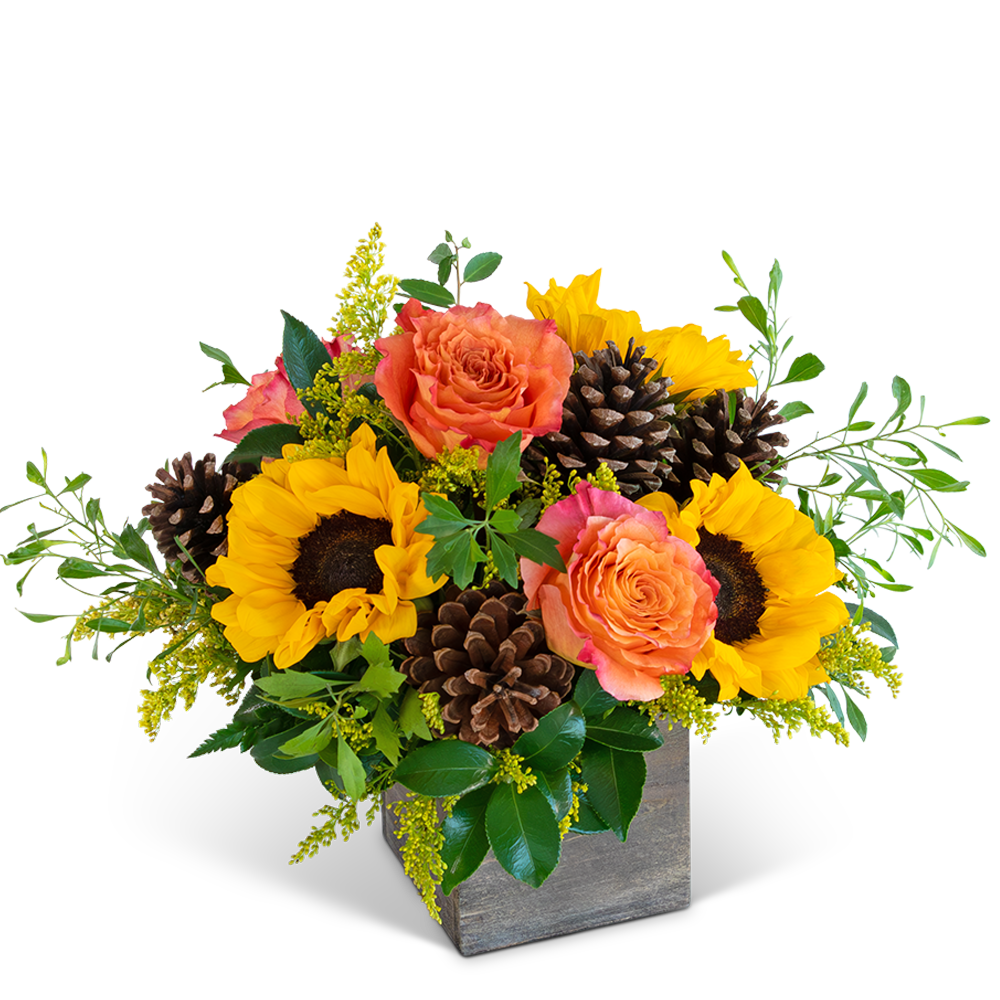 Capture the essence of autumn with our Harvest Sunburst Harmony arrangement, featuring sunflowers, roses, pine cones, and premium foliage in a rustic wooden cube container. This blend of vibrant blooms and natural elements captures the essence of the season. Upgrade to deluxe or premium for additional blooms added in, enhancing the beauty and fullness of this stunning floral arrangement.