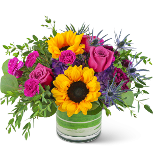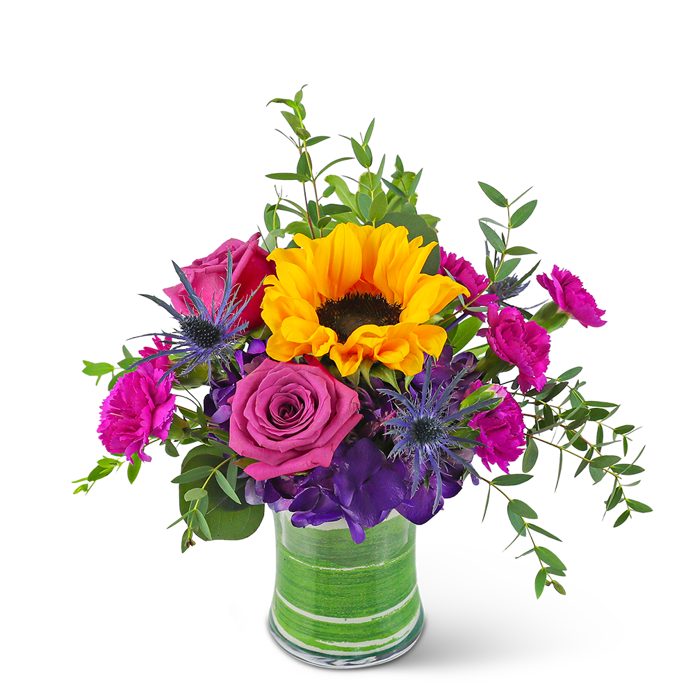 Send a gift of style and elegance with Sunny Blooms. This stunning arrangement contains hydrangea, roses, carnations, and a bright sunflower, along with premium foliage. The bright color combination makes it the perfect get-well or birthday gift that will make their day. Sunny Blooms is a sunny, soft bouquet that is full of life and beauty.