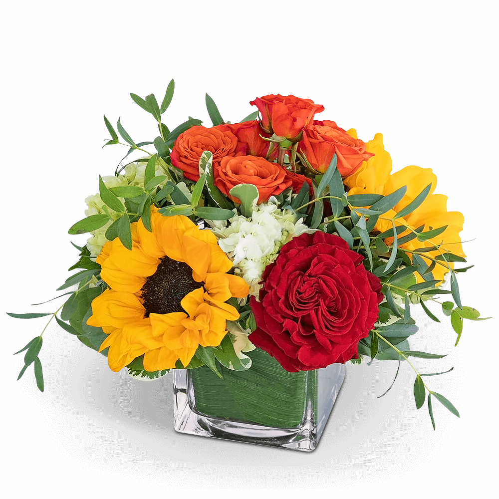 The warm glow of Savannah is captured in this stunning arrangement. Sweet Savannah features roses, hydrangea, sunflowers, and premium foliage. Whether celebrating a birthday, a new baby, or the beauty of fall, this bouquet will add just the right touch of warmth to your celebration. This burst of colorful flowers is designed by our florist in a leaf-lined, modern glass vase to create a gift that will truly shine.