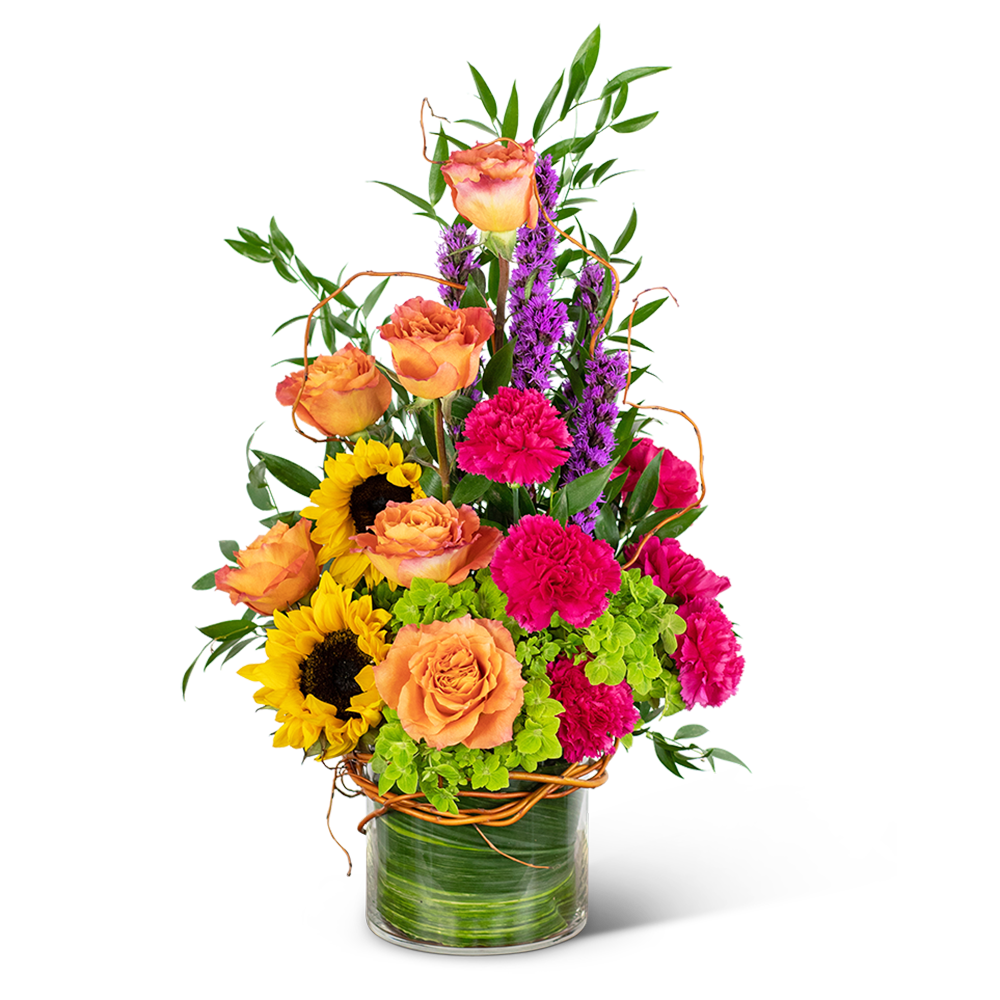 Sympathy flowers are a meaningful way to celebrate the life of the deceased, and forever treasure the memories you made together. Our Treasured Memories Vase features Free Spirit roses, sunflowers, bright pink carnations, liatris, stock, green hydrangea, premium foliage, and curly willow. Funeral flowers bring healing in many ways, they serve as a memorial to honor the one that we lost, all while providing comfort to the friends and family left behind.