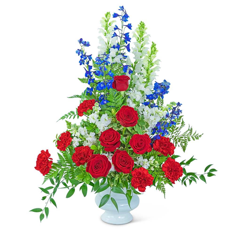 This beautiful red, white, and blue design honors the valiant effort of the ones who served our country with honor. It is filled with red roses and carnations, blue delphinium, and white snapdragons surrounded by a variety of premium foliage. The Valiant Urn is the perfect sympathy arrangement to send to a funeral or to a grieving family to let them know their loved one will never be forgotten.