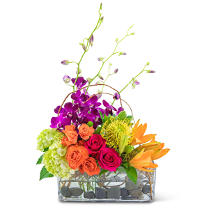 The soft blues and whites of this arrangement will add a touch of tranquility to any room. This peaceful bouquet combines blue hydrangea, white roses, blue eryngium, lily grass, solidago, limonium, and Italian ruscus in a clear glass vase. Wilde Blue is perfect for a new baby, get well, or just because gift.
